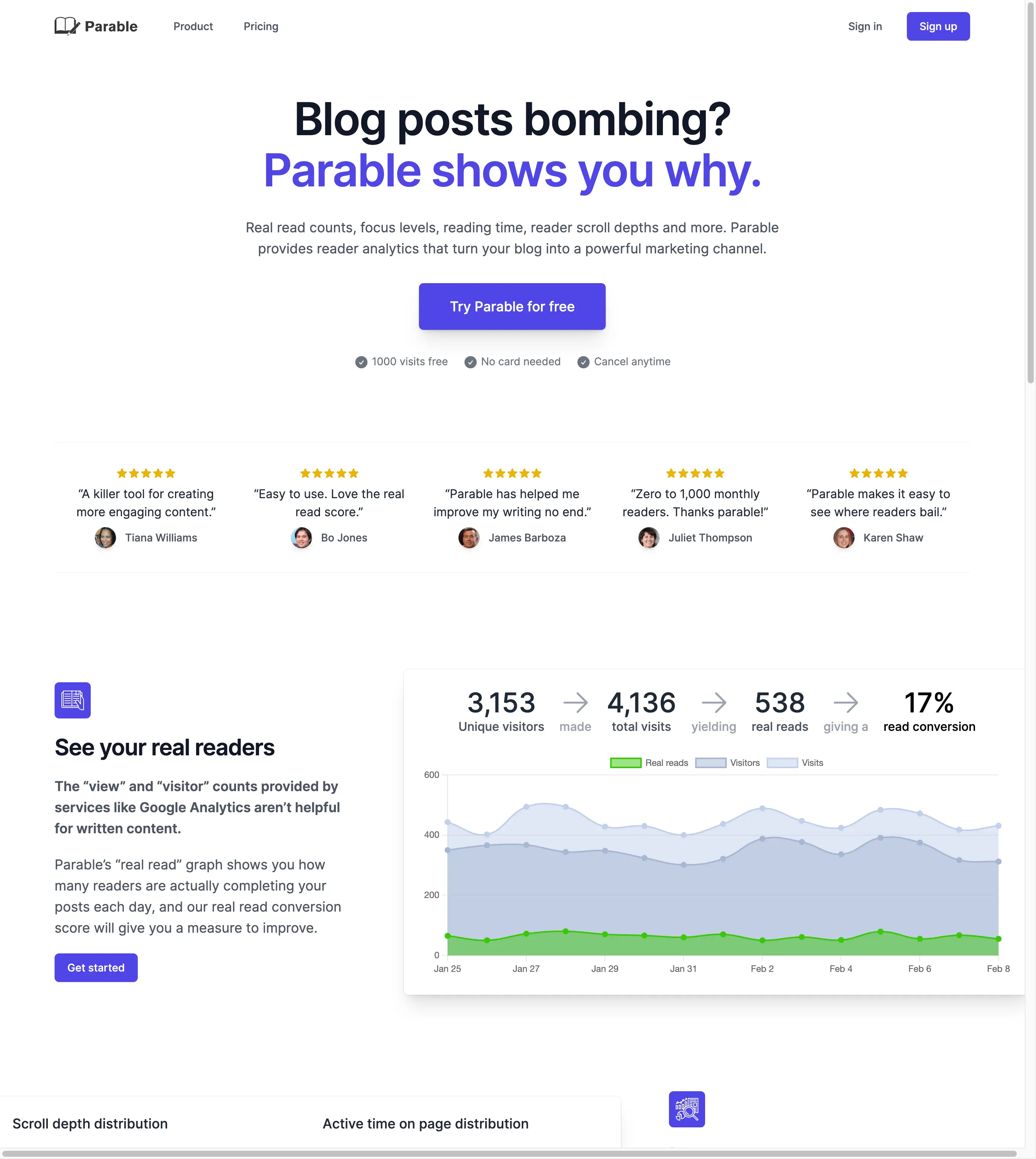 I spent my unbooked time in 2022 building Parable, an indie analytics platform for blog posts and articles. Parable intelligently tracks how many people actually read your content, and focuses on providing analytics useful to writers trying to grow an audience.
