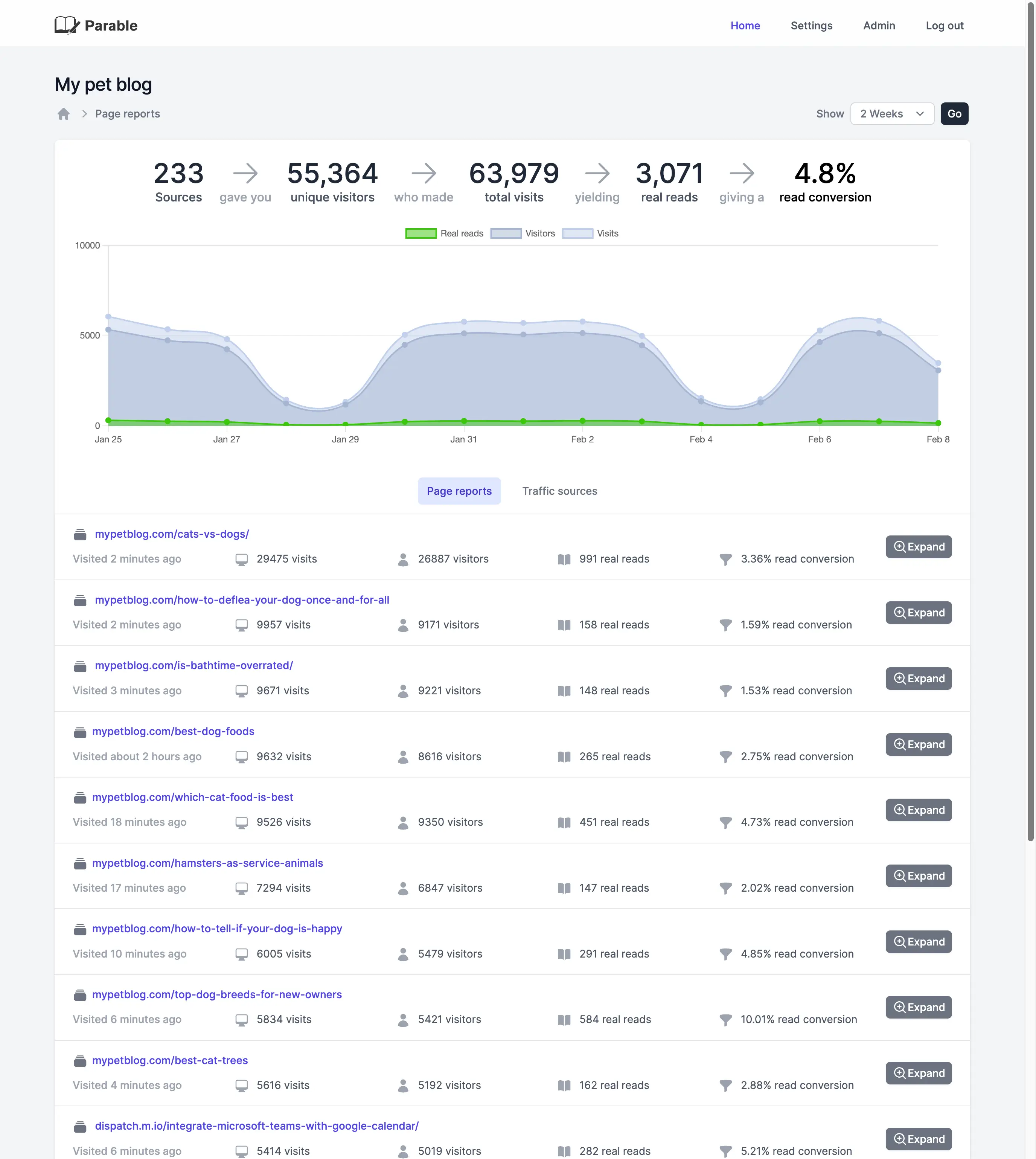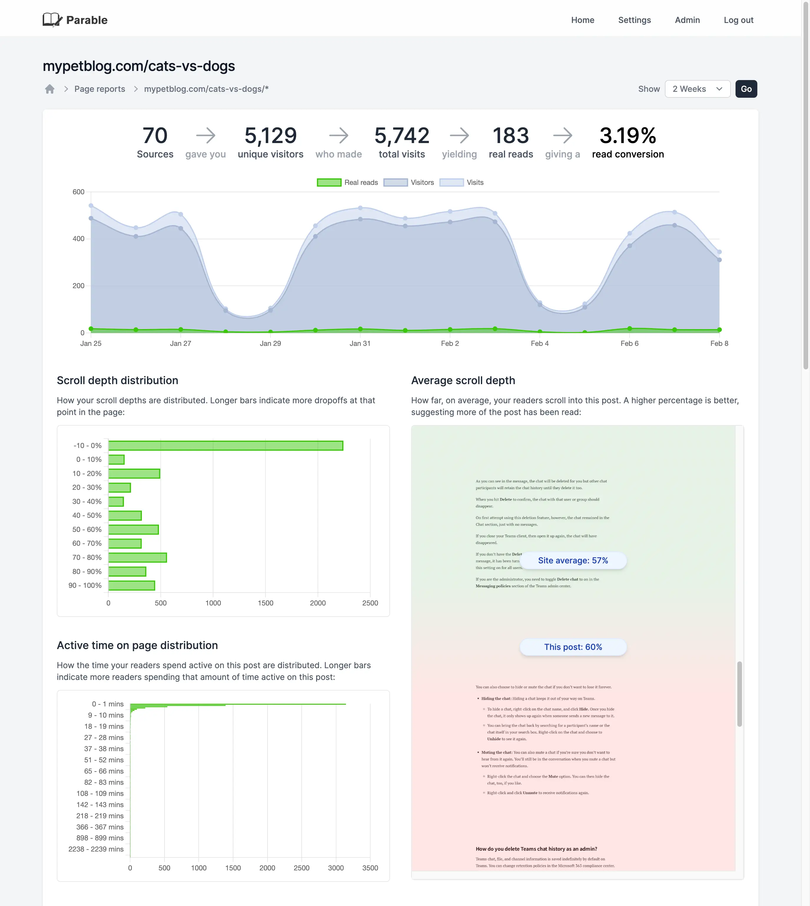 Parable’s headline feature was that it could show you how many people were reading your content, rather than just how many visits your content was receiving. It also included tools tailored for content analysis - traffic sources, scroll depths, reading times, focus break frequency, and browser stats (to name but a few!).